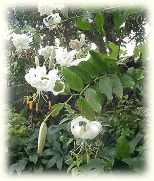 草むらの中へ静かにかしずく。 いく輪もの大きな花が咲き並び, 庭に立つユリの花姿はうるわしい。 風にゆらゆらと吹かれ, その存在感に一歩踏み出し近づいてみる。 |